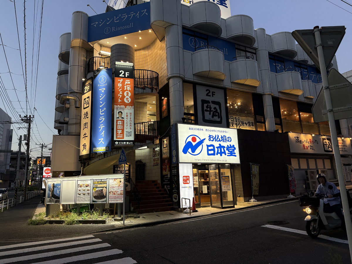 今回向かったのは東戸塚店。東戸塚駅より徒歩5分くらいにあり、バイクは東口の東戸塚オーロラシティに3時間無料のパーキングはあるし、車もお店の近くに有料のコインパーキングがあるのでアクセスはなかなかいいです。画像のお仏壇の日本堂の横にある階段を上がった2Fに牛角と同じフロアに店舗があります。