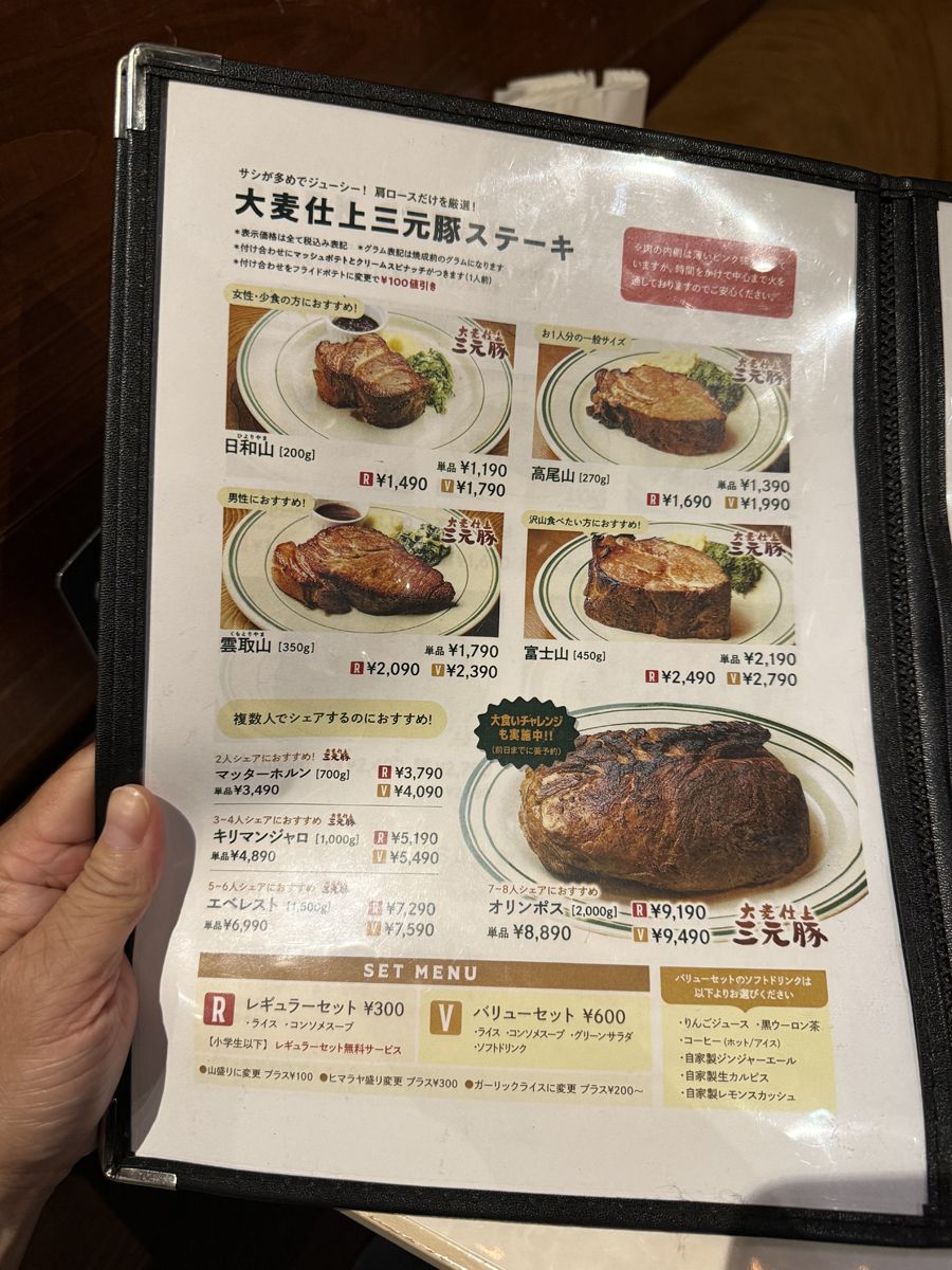 メニューはこんな感じで、大麦仕上3元豚ステーキか、カナダ産ポークステーキのどちらかを選びます。後は200g 〜 2kg!? まで自分が食べたいサイズを選び、セットメニューをつけるかどうかを選びます。