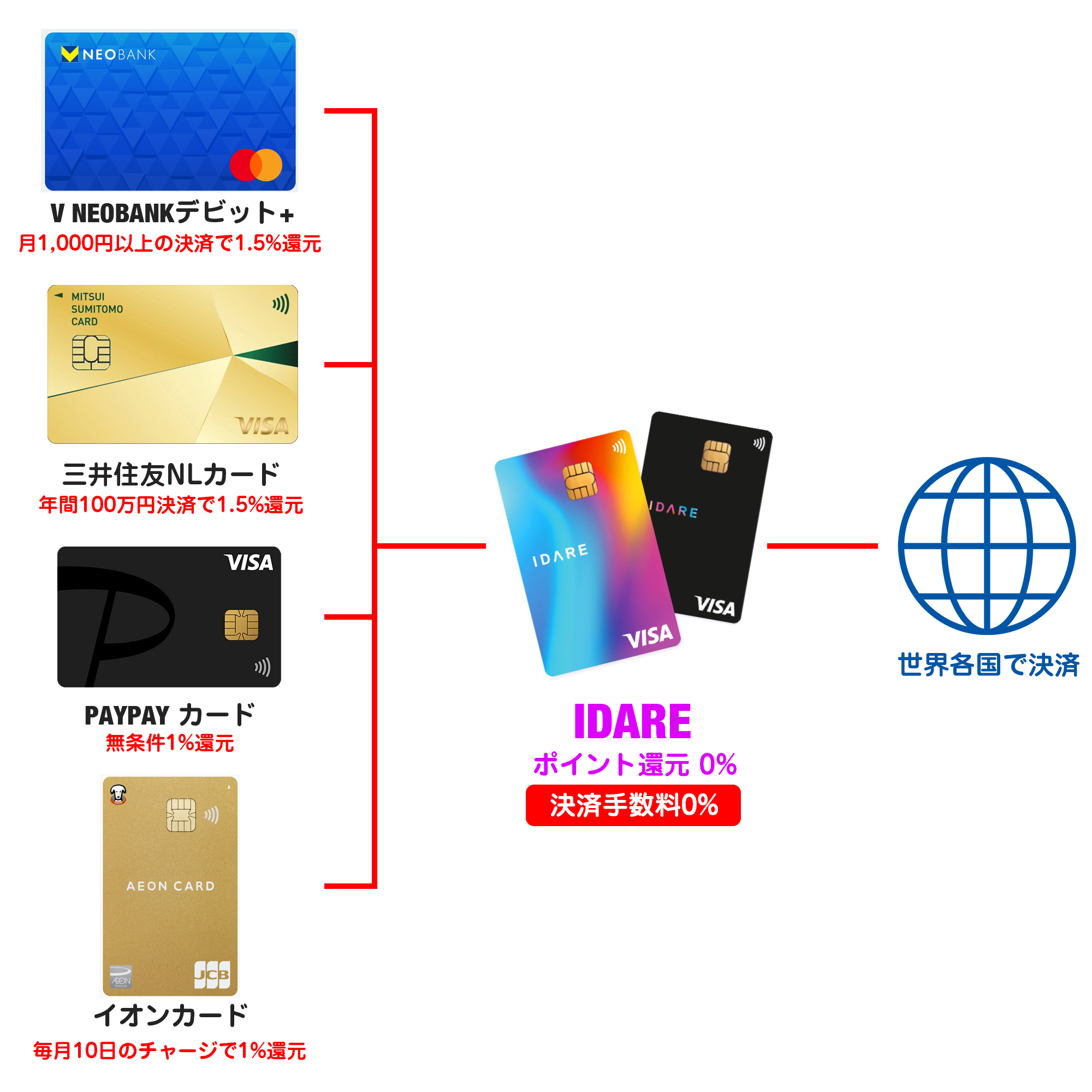 何がいいのかというと、携帯一つでいつでも日本円でチャージ可能で、決済手数料が無料です。複雑な物や今後改悪が予定されているチャージ方法は省き、出口は海外で利用することを前提にお得なルートを提案しました。みなさんがお持ちのカードでも同様にできるかもしれないので、IDEAR にチャージしてポイントが付くか確認してみてください。