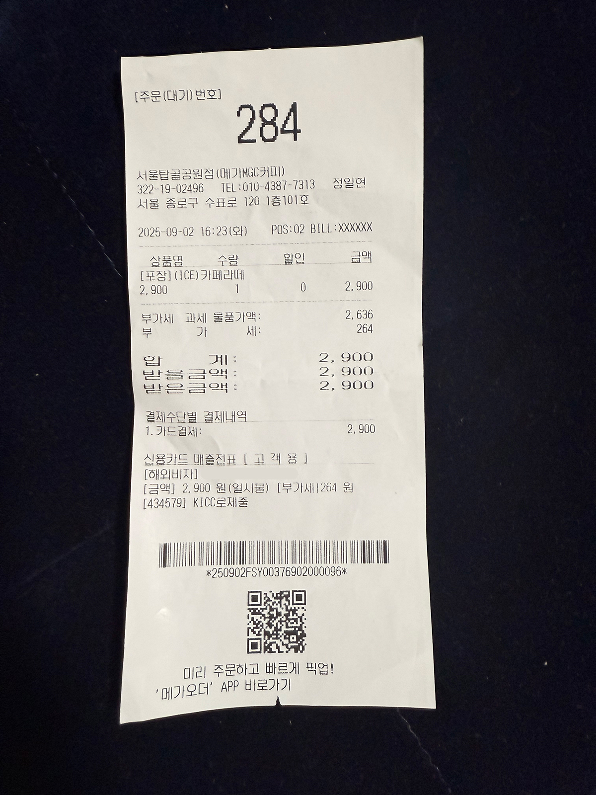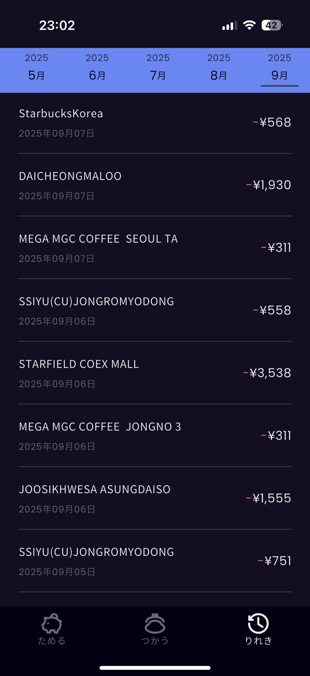 安くてたっぷりな量のドリンクが飲める MEGA COFFEE がホテルの近所にあったので、ほぼ毎日通っていました。この ICE Latte が一杯驚きの W2,900なんですが、IDEARE の請求は 309円。本日のレートが W941.90 = ¥100 なので、レート換算で307.89円となり、ほぼ為替レート通りに手数料がないのがわかってもらえると思います。