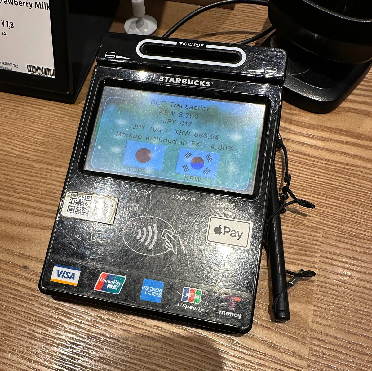 カード決済で気をつけなければいけないのは、タッチ決済が可能な端末も多くありますが、日本と違いタッチ決済でも、サインが必要になります。端末により違いますが、画像のように日本か韓国か選択する場面に遭遇します。この場合は迷わず韓国を選択してください。
