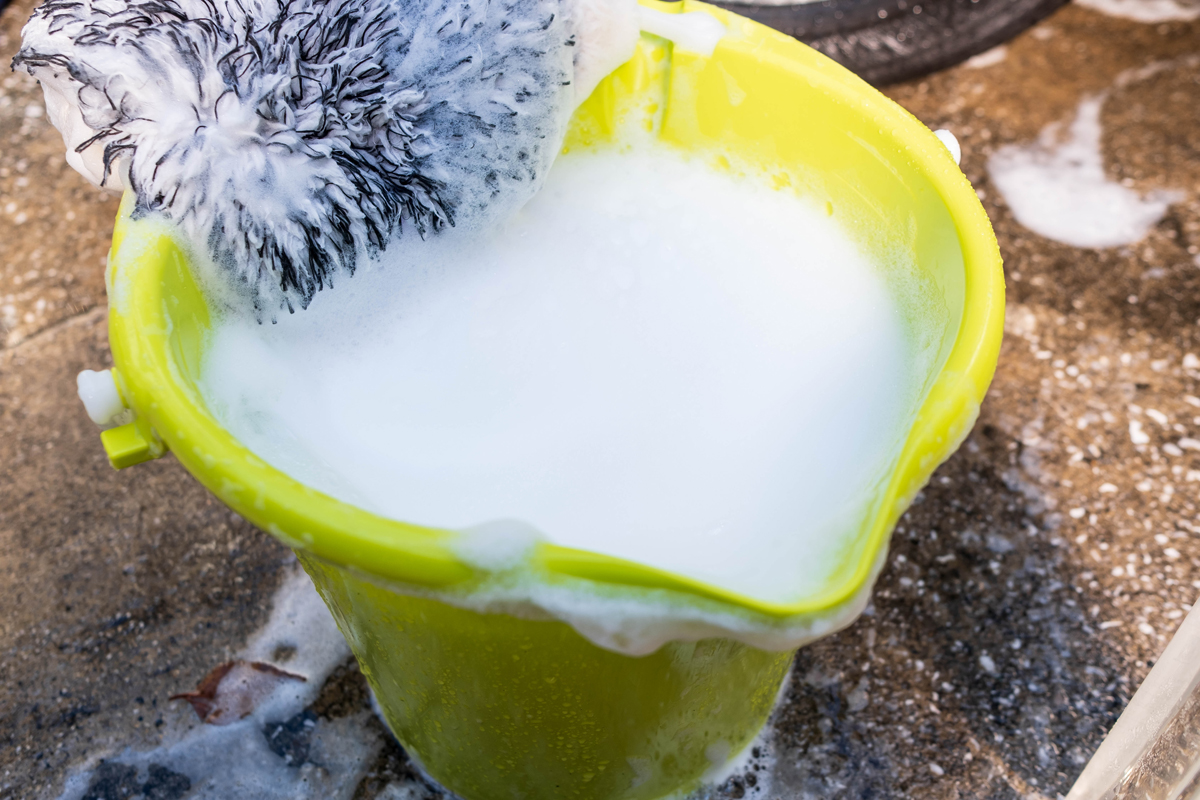 試しにキャップ一杯でシャンプー液を作って足回りを洗ってみましたが、若干薄く感じたので、ボディーを洗う時はキャップ2杯でシャンプー液を作ってみました。写真はキャップ2杯で作った時の様子です。
